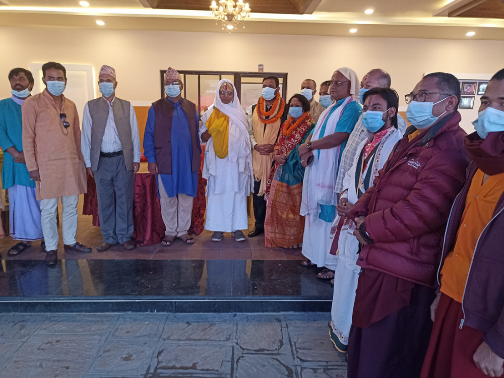 सम्पर्क कार्यालयको उद्घाटन अघि विभिन्न मन्दिरका पुजारी तथा पण्डितहरूबाट पूजाआजा गराएपछि तस्बिर खिचाउँदै निधि । तस्बिर : रामजी दाहालको फेसबुकबाट